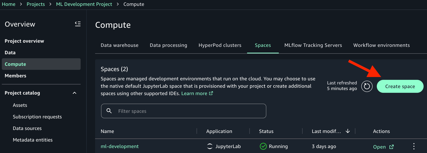 In our ML development project, navigate to the ComputeSpacesCreate space option, and choose JupyterLab in the Application (space type) menu to launch a new JupyterLab IDE.