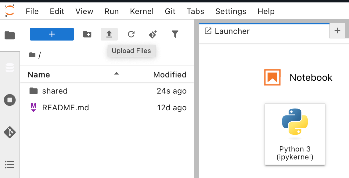 With our space created and running, we choose the Open button to launch the JupyterLab IDE. Once loaded, we upload the sample Jupyter notebook into our space using the Upload Files functionality.