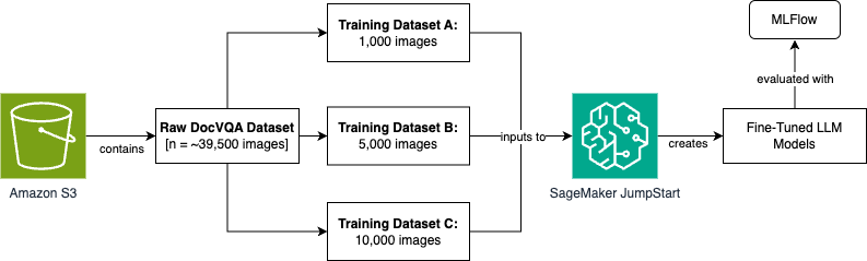 To improve model performance through fine-tuning, we’ll use the DocVQA dataset from Hugging Face. This dataset contains 39,500 rows of training data, each with an input image, a question, and a corresponding expected answer. We’ll create three fine-tuned model versions using varying dataset sizes (1,000, 5,000, and 10,000 images). We’ll then evaluate them using Amazon SageMaker fully managed serverless MLflow to track experimentation and measure accuracy improvements.