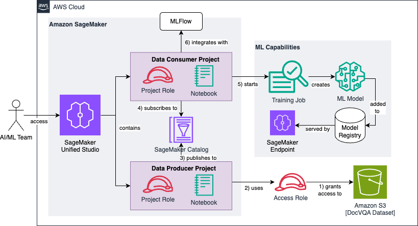 1. First, you create and configure an IAM access role that grants read permissions to a pre-existing Amazon S3 bucket containing the raw and unprocessed DocVQA dataset.