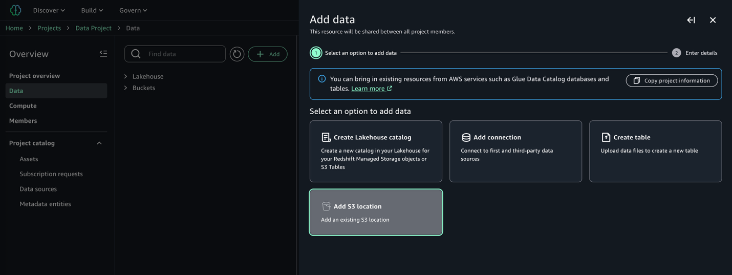 Once our access role is created following the instructions in the documentation referenced previously, we can continue with discovering and cataloging our dataset. In our data producer project, we navigate to the Data → Add data → Add S3 location: