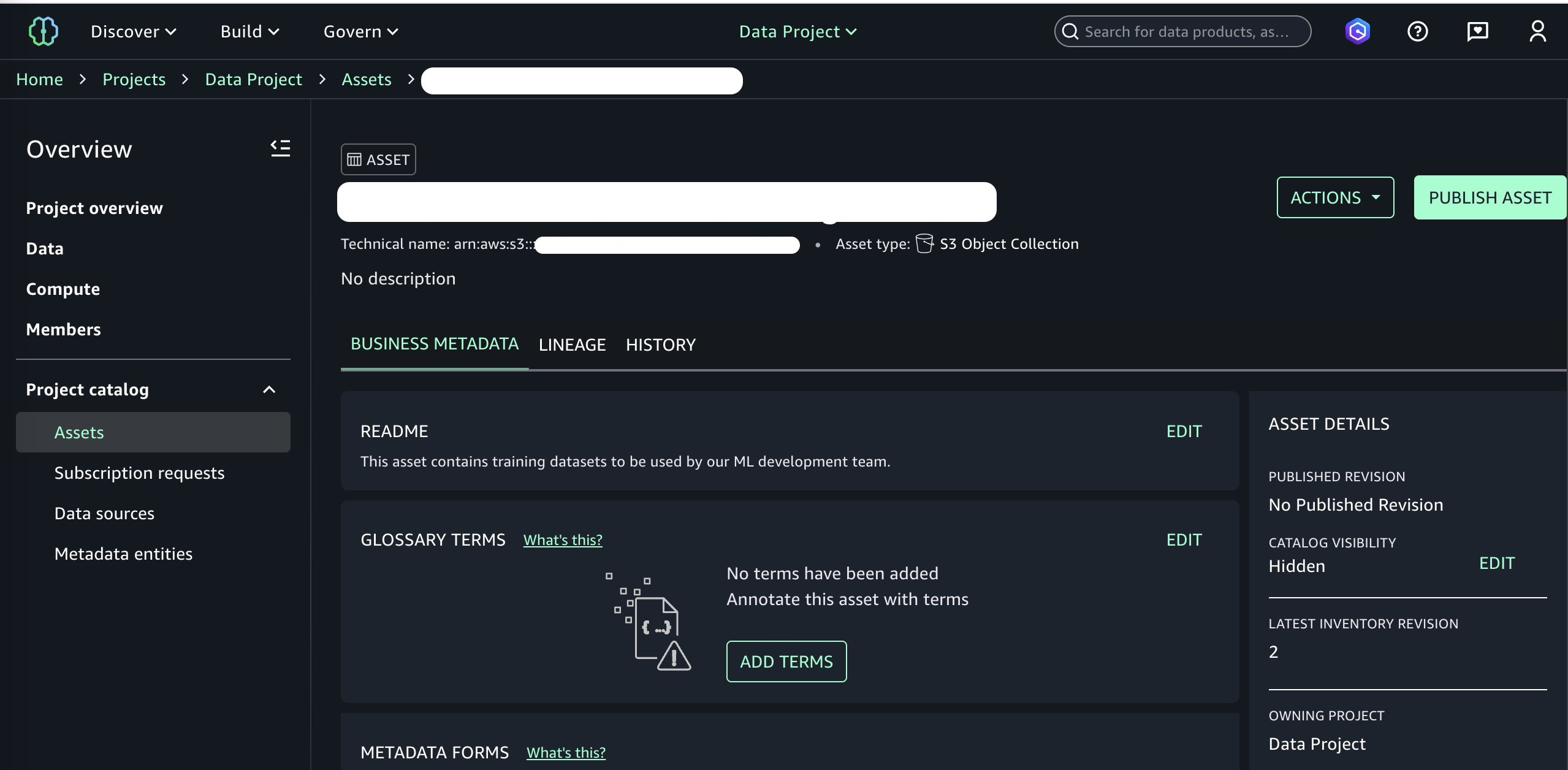 We are now ready to publish this bucket to our SageMaker Catalog. We can add optional business metadata such as a README file, glossary terms, and other data types. We add a simple README, skip other metadata fields for brevity, and continue to publishing by choosing Publish to Catalog under the Actions menu.
