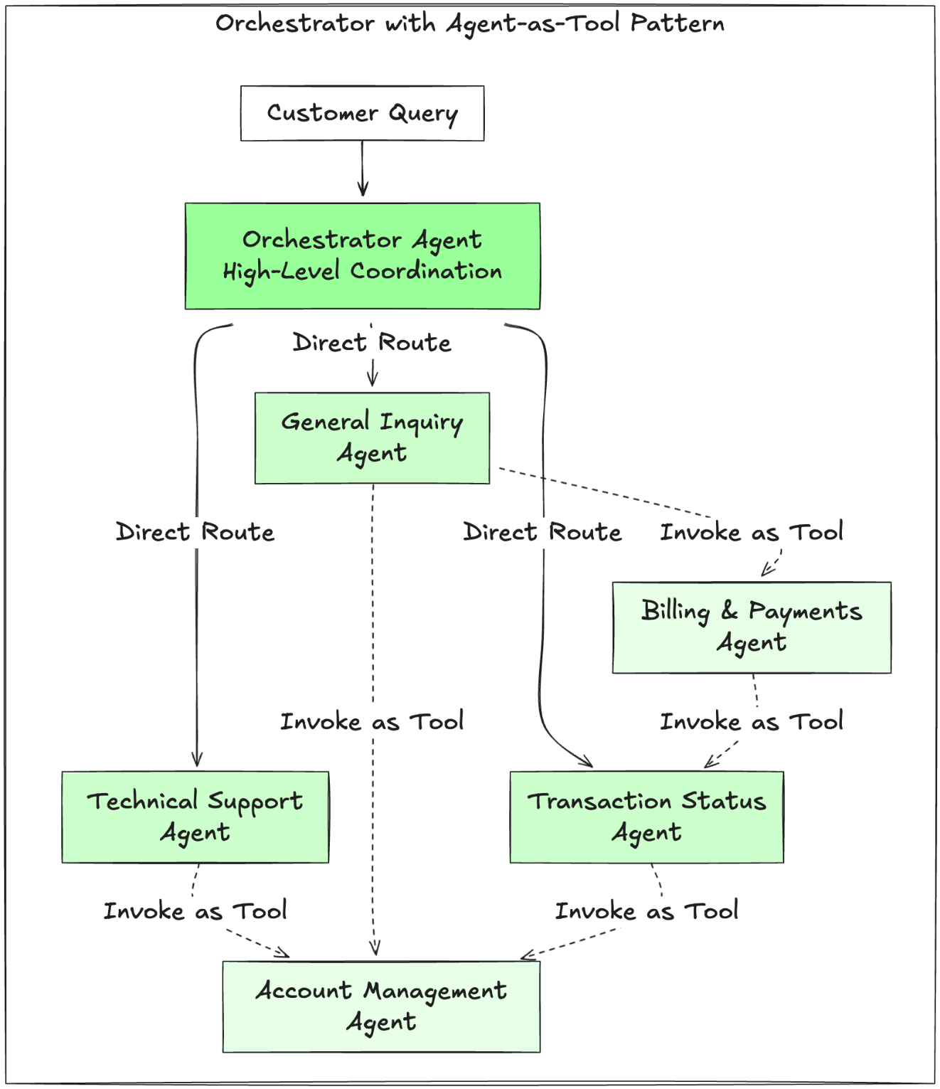 With this agent-as-tool pattern, primary agents detect when they need specialized help. Tool agents are invoked dynamically by primary agents. Agents can call other agents through a well-defined interface—they become tools in each other’s toolkits.