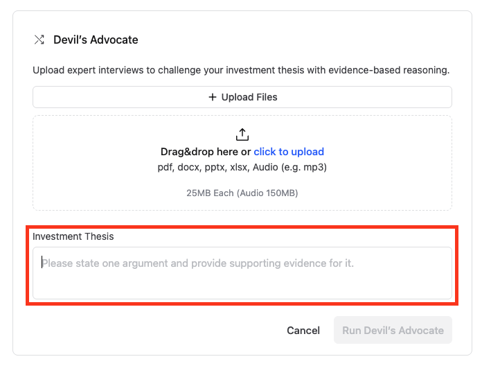 Conviction drives investment decisions, but an unexamined investment thesis can introduce risk. Before allocating capital, investors often ask, “What am I overlooking?” Identifying blind spots usually involves time-consuming cross-referencing of expert calls, broker reports, and filings. Confirmation bias and scattered workflows make it hard to challenge one’s own ideas objectively. Consider the example thesis, “ABCD will be a generative AI beneficiary with successful AI monetization and competitive positioning.” The thesis seems sound until you probe whether open source alternatives could erode pricing power or if monetization mechanisms are fully understood across the product stack. These nuances often get missed. This is where a devil’s advocate comes in, a role or mindset that deliberately challenges the thesis to uncover hidden risks and weak assumptions. For investors, this kind of structured skepticism is essential to avoiding blind spots and making higher-conviction decisions.