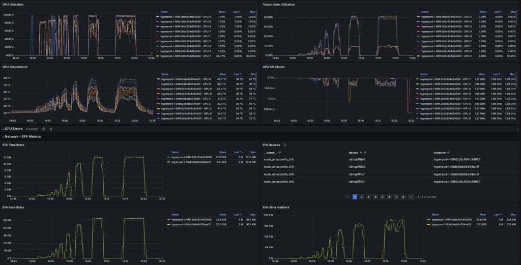With SageMaker HyperPod’s observability dashboards, you can monitor key metrics during inference time such as GPU utilization, EFA metrics and error counts for proactively monitoring and optimizing your inference workloads.
