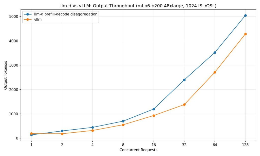 In our testing, we found that using llm-d’s prefill/decode disaggregation path increases tokens per second by up to 70% as concurrency increases compared to using a standard vLLM deployment when load testing with an input sequence of 1024 input tokens and receiving 1024 output tokens up to a concurrency of 128. This performance profile varies based on your vLLM configuration and workload. Tuning your prefill/decode ratio and other parameters available from vLLM server can potentially bring more performance.