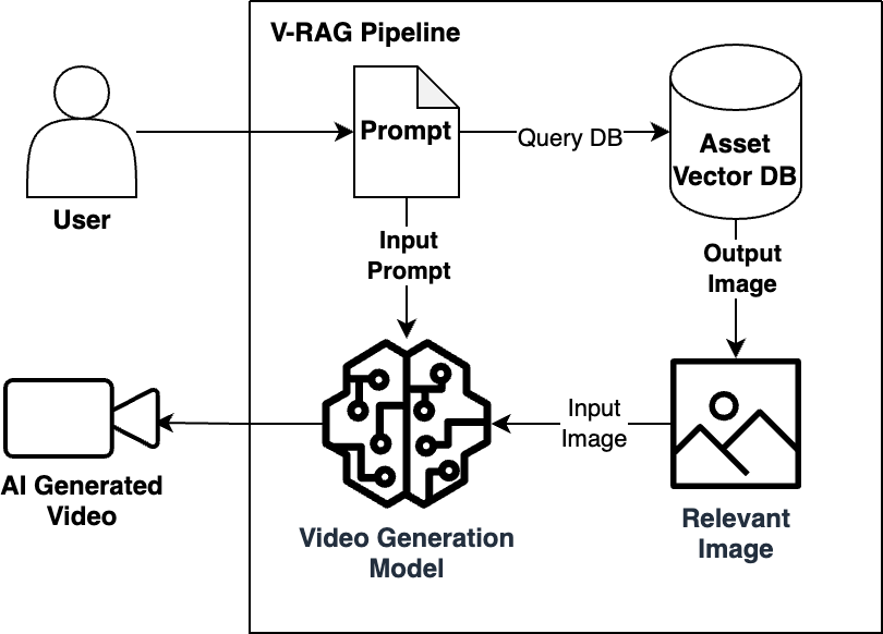 Diagram of the V-RAG Pipeline showing data flow from user prompt through a vector database to a video generation model producing AI-generated video.