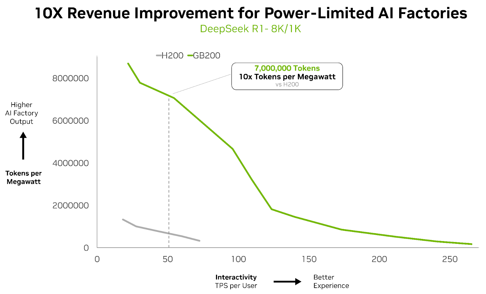 Simply put, because GB200 NVL72 processes ten times as many tokens using the same time and power, the cost required to generate each individual token drops. GB200 NVL72’s order-of-magnitude efficiency gains far outweigh its incremental increase in costs, resulting in significantly better token economics.