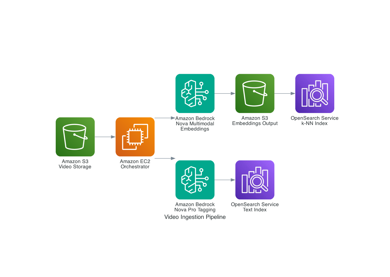Figure 1: Video ingestion pipeline showing the flow from S3 video storage through Nova Multimodal Embeddings and Nova Pro to dual OpenSearch indexes
