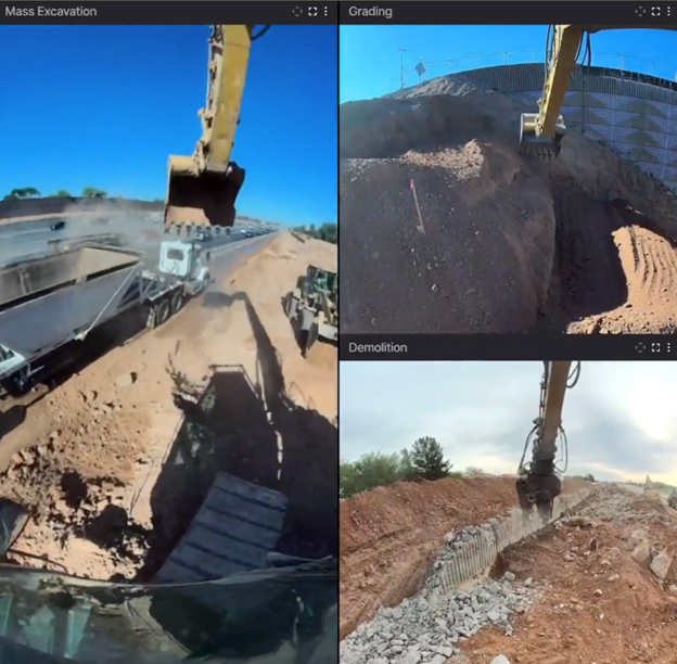 Enabling autonomous construction equipment requires extracting useful information from millions of hours of unstructured operational footage. Specifically, Bedrock Robotics needed to identify tool attachments, tasks, and worksite conditions across diverse scenarios. The following images are example video frames from this dataset.
